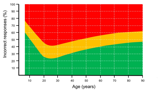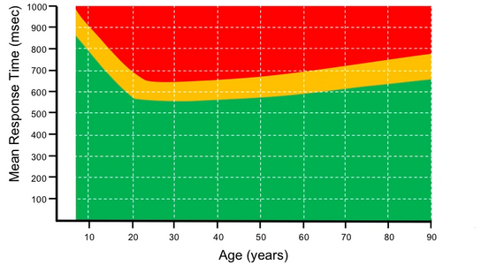 SCIT can also be used as a once-off measure to assess how the functioning of a participant’s brain compares to healthy individuals of the same age. To do this, the participant’s results are compared to charts of normative data. Simply print out the charts and use a pen to indicate the location of the participant’s scores. Green areas correspond to the results obtained from healthy individuals, amber indicates possible mild impairment, while red indicates probable impairment.