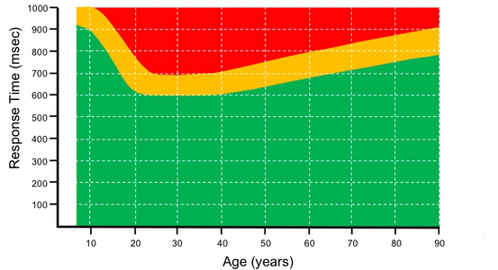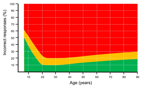 It takes around 20 years for the developing brain to become fully myelinated. Consequently performance on SCIT reaches a peak during the third decade of life. Thereafter, the natural ageing process involves a gradual loss of neurons that affects the ability to process information quickly and accurately. As the rates of brain maturation and ageing differ between people, healthy individuals of the same age can perform differently on SCIT.