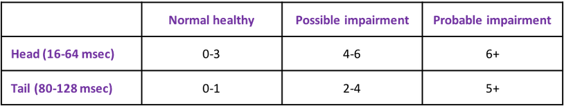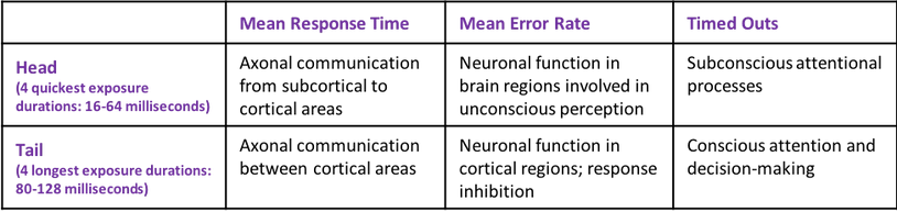 The Tail consists of durations of 80 milliseconds or more, where the stimulus is displayed for long enough that it reaches conscious awareness. Scores for the Tail indicate how effective the frontal cortex is at making quick judgements.